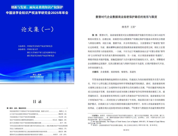 11月8日至9日,中国法学会知识产权法学研究会2025年年会在杭州顺利举行。来自全国知识产权法学理论界、实务界的专家学者共话学科发展前沿,我院数字智能法治研究中心讲师王轩博士、2024级法律(非法学)研究生赵胤豪应邀参会。