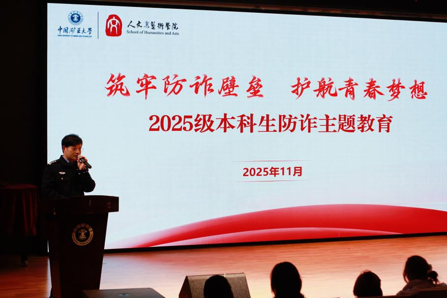为增强我院大一新生识诈能力和反诈意识,培养安全观念,11月18日晚,人文与艺术学院在学术报告厅开展防诈教育主题活动。学院副院长刘振出席,徐州南站派出所副所长祁中誉担任主讲,学院2025级全体本科生参与。活动由2025级专职辅导员程金松主持。