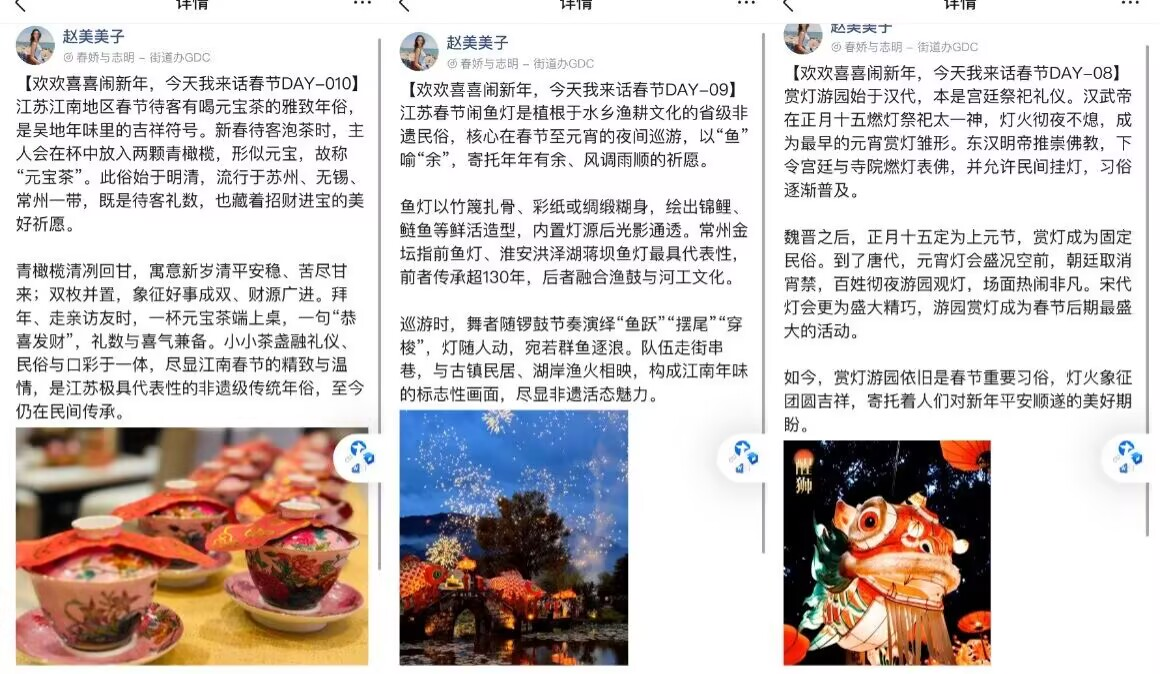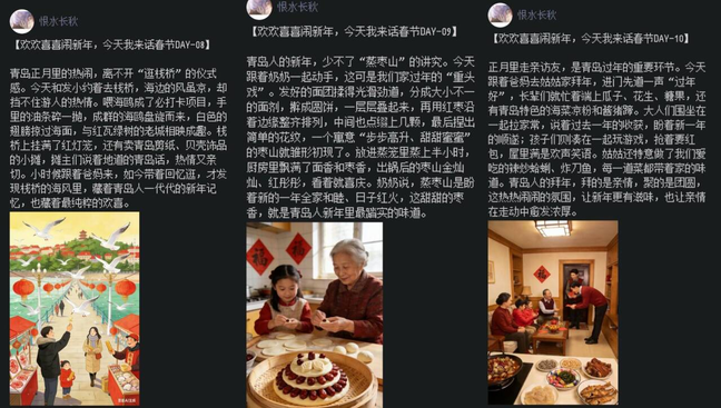 活动中,同学们在QQ空间或朋友圈里以春节为主题编辑并完成了数十条打卡内容,如分享全家守岁看春晚、走亲访友的温馨瞬间,或记录过年贴春联、包饺子的热闹场景,在烟火气里诉说着对团圆的珍视。本次活动将传统文化传承与同学们的线上实践相结合,为同学们搭建了分享新春、交流地域文化的平台,度过一个有意义的新春佳节。
