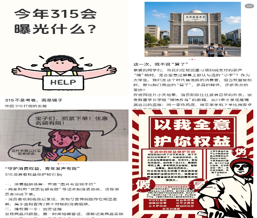 活动以新媒体创作形式为载体,鼓励同学们将消费维权知识、法律解读等核心内容融入到短视频、图文作品中,在创作与传播中深化同学们对消费权益的理解,让消费维权知识走进校园,调动学生们主动学习以及传播积极性。活动面向联办学院全体学生,同学们细数校园消费陷阱的识别技巧,追忆维权经历的成长点滴,诉说对理性消费的规划与期许,让每一部作品都成为了连接校园与社会的普法纽带,展现了矿大学子丰富的内心世界与强烈的社会责任感。